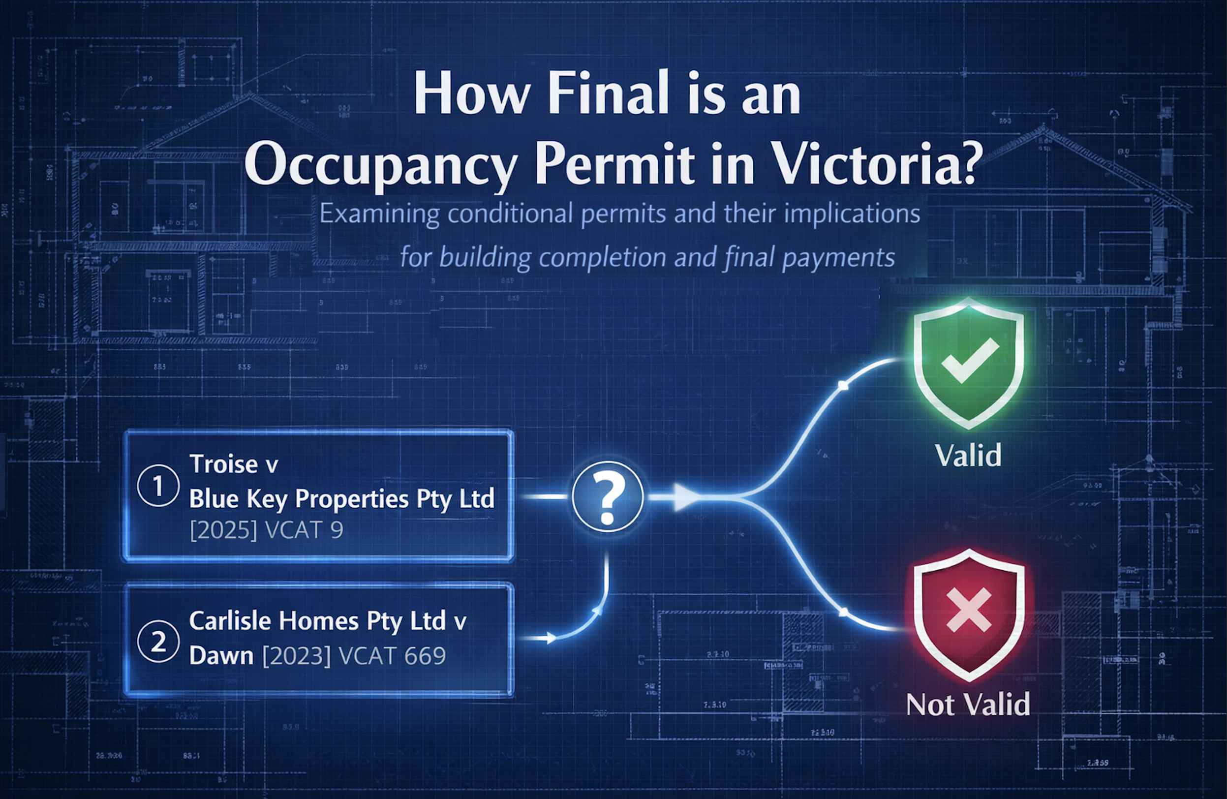 On the other hand, the earlier 2023 case decision in Carlisle (another VCAT litigation) had held that conditional Occupancy Permits when issued by the Relevant Building Surveyor (“the RBS”) were perfectly valid and this meant that the Builder could require the final payment claim to be paid before kitchen or laundry appliances were installed.